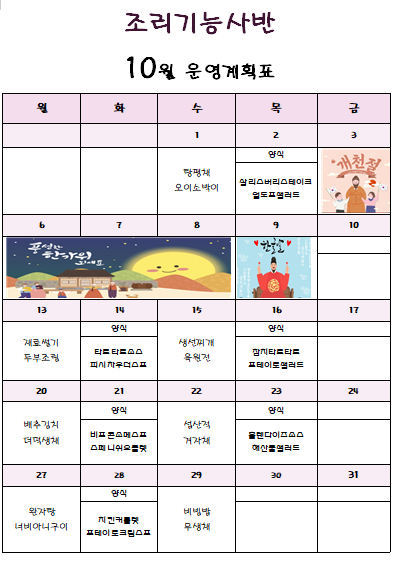 10월 한식조리기능사 양식조리기능사 시간표 입니다.